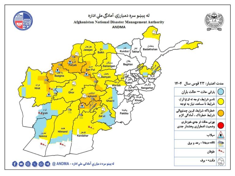خبرگزاری پیگرد-افغانستان نوشته شده توسط -حسنا شمسی شنبه، ۲۲ قوس، ۱۴۰۴ ریاست هواشناسی کشور از حتمال بارش باران و رعدبرق...