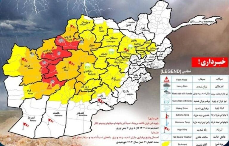 ریاست هواشناسی از احتمال برفباری، باران شدید، رعدوبرق و بادهای نسبتاً شدید در ۲۳ ولایت کشور خبر داد