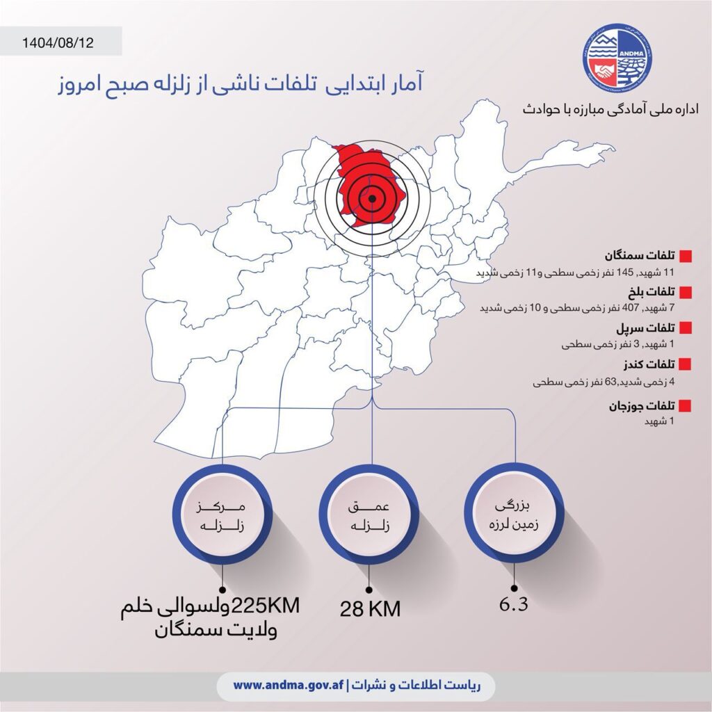 از سوی هم بر اساس اطلاعات ابتدایی مسئولان ریاستهای ولایتی اداره ملی مبارزه با حوادث، در ولایتهای بلخ، سمنگان، سرپل، جوزجان و کندز، آمار اولیه تلفات، ۲۰ تن شهیدان (کشتهشدگان)، ۲۵ تن زخمیان شدید، و ۶۱۸ تن زخمیان سطحی، گزارش شده است.
