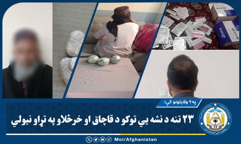 وزارت امور داخله کشور اعلام کرده است که منسوبان پولیس مبارزه با مواد مخدر، ۲۳ تن را در پیوند به قاچاق و فروش مواد مخدر از ولایت های خوست، ارزگان، کندز، نیمروز، بلخ، پروان، میدان وردک، سرپل، و کاپیسا بازداشت نموده و پس از تحقیقات اولیه به نهادهای عدلی و قضایی سپرده خواهند شد.