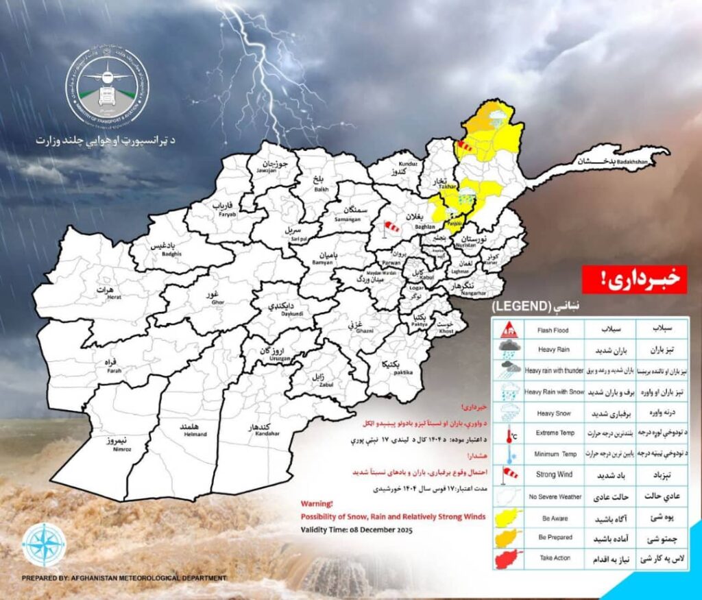 ریاست هواشناسی وزارت ترانسپورت و هوانوردی کشور با نشر خبرنامهی از احتمال بارش باران و برف در چهار ولایت کشور هشدار میدهد.
