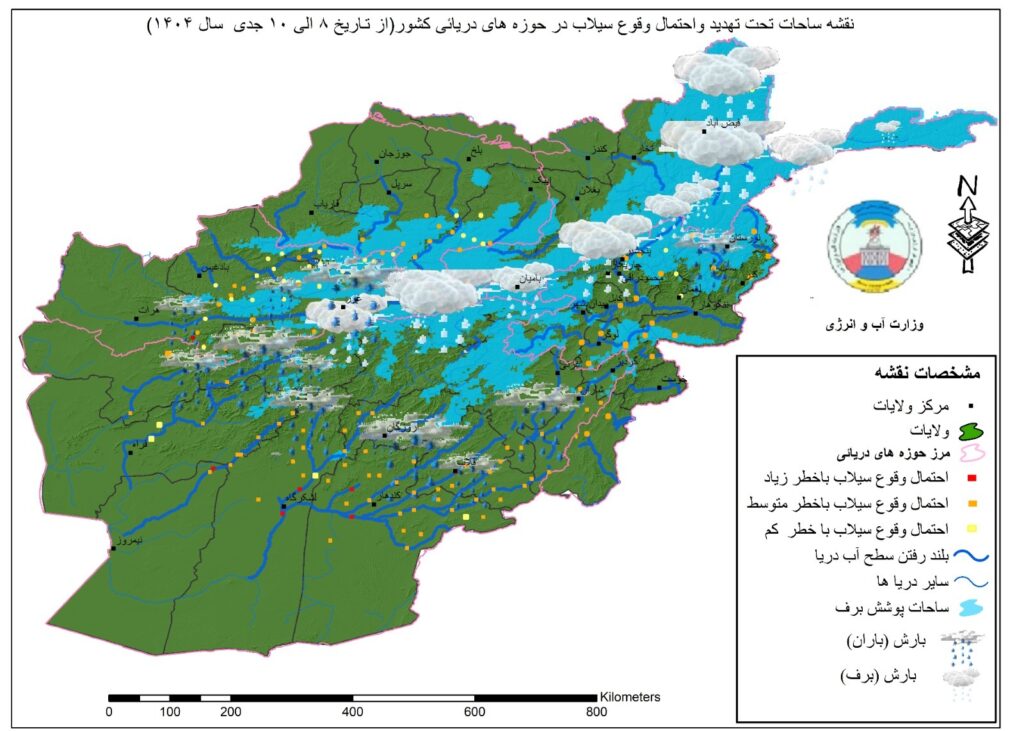 ریاست هواشناسی کشور و ارگانهای معتبر هواشناسی جهانی از احتمال بارش باران همراه با سیلاب های آنی در ساحات حوزه های ( هریرود، مرغآب، هلمند، شمال، پنج آمو، کابل و برخی سیلبرهای مربوطه هشدار داده است۰