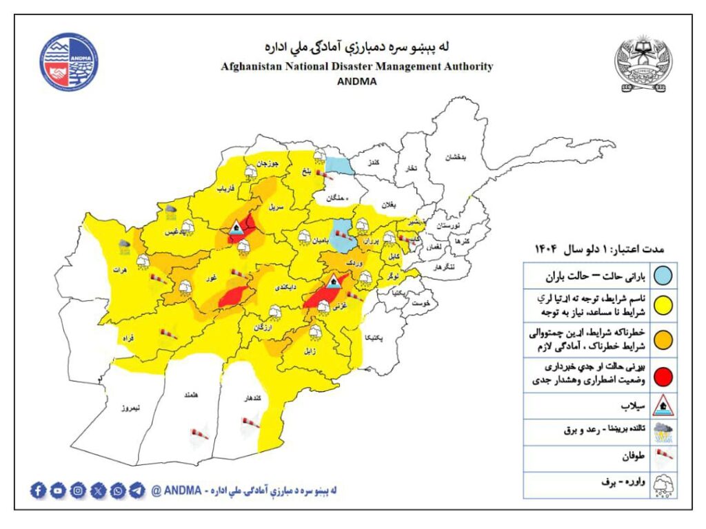 ریاست هواشناسی وزارت ترانسپورت و هوانوردی با استناد به پیشبینیهای داخلی و نهادهای معتبر بینالمللی هشدار داد که احتمال وقوع بارندگیهای شدید، برفباری، رعد و برق و سرازیر شدن سیلابهای آنی در شماری از ولایتهای کشور وجود دارد.