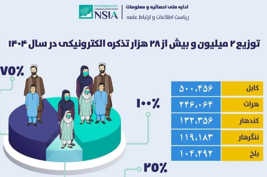 اداره ملی احصائیه و معلومات از توزیع توزیع تذکره الکترونیکی برای دو میلیون و ۲۸ هزار و ۷۹ تن در سال ۱۴۰۴ خبر میدهد.