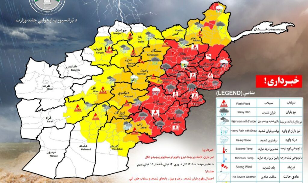 وزارت ترانسپورت و هوانوردی با نشر اطلاعیهای اعلام کرده از احتمال وقوع بارندگی شدید همراه همراه با رعد و برق به روزهای جمعه و شنبه (۱۴ و ۱۵ حمل) بیش از ۳۰ ولایت کشور خبر میدهد.