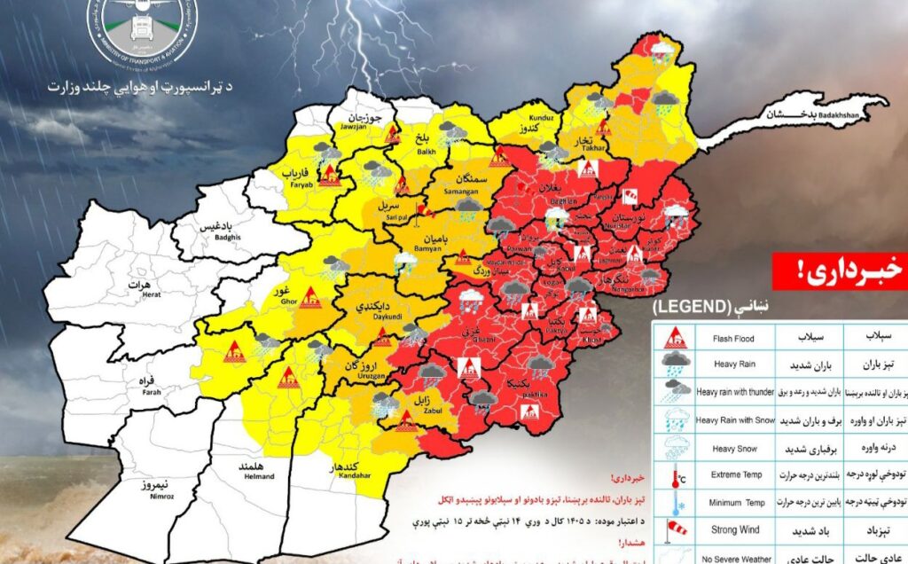 ریاست هواشناسی وزارت ترانسپورت و هوانوردی امروز دوشنبه، ۱۷ حمل، سال روان میگوید که، تمامی ولایتهای کشور بهجز ولایت نورستان، گواه بارندگیهای شدید بوده و خطر سرازیرشدن سیلابهای آنی در ۳۳ ولایت افغانستان نیز وجود دارد.
