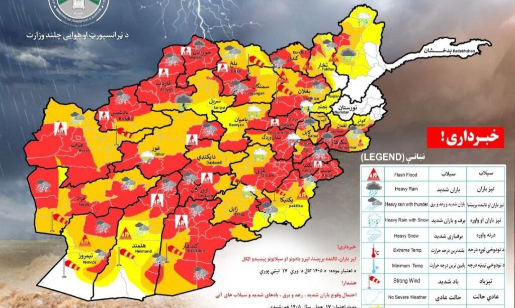 ریاست هواشناسی وزارت ترانسپورت و هوانوردی امارت اسلامی افغانستان از احتمال بارش باران و وقوع سیلاب در شماری از ولایتهای کشور خبر داده است.