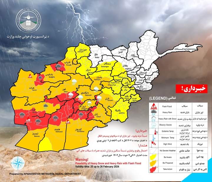 ریاست هواشناسی ا.ا هشدار داده است که احتمال بارش سنگین برف و باران در ۲۴ ولایت افغانستان همراه با سیلابهای آنی در روزهای یکشنبه، و دوشنبه هفتهی جاری وجود دارد.