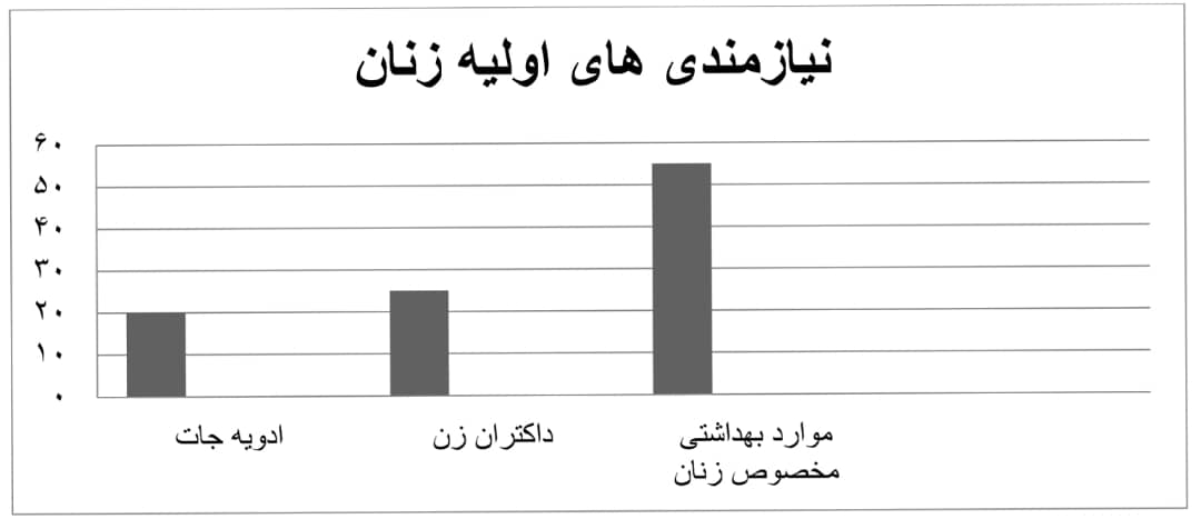 از میان زنانی که با آنها مصاحبه صورت گرفته است تقریبا ۵۵ درصد آنان نیاز مبرم به اقلام بهداشتی مخصوص زنان داشتند. از این میان ۲۵ درصد آنان میگویند که نیاز به داکتران زن دارند زیرا بجز بخش های ولادی در بخش های دیگر داکتران زن موجود نبوده و ۲۰ درصد آنان گفته اند که نیاز اولیه به ادویهجات دارند. شمار بزرگ این زنان میگویند که خدمات صحی و بهداشتی برای آنان به میزان خیلی کم بسنده بوده است.